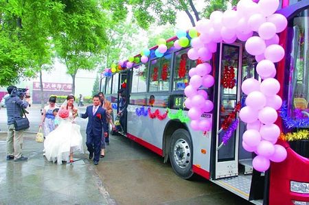 5月16日清晨,一輛被裝扮一新的“公交婚車(chē)”從石家莊市駛往井陘。有過(guò)往市民在看到這輛引人注目的“婚車(chē)”后,忍不住發(fā)出感慨:“這比凱迪拉克當(dāng)婚車(chē)還拉風(fēng)啊!倍俗谶@輛公交婚車(chē)上的新郎趙欽,則一路幸福地盼望著迎接新娘。據(jù)介紹,此次婚禮的一對(duì)新人都是公交司機(jī),以公交車(chē)當(dāng)婚車(chē)既是因?yàn)閷?duì)公交車(chē)有特殊感情,也是希望倡導(dǎo)低碳生活。