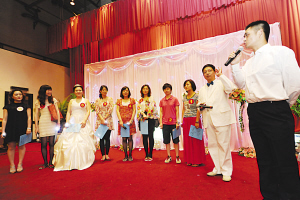 當(dāng)舞臺背景展開“杰出男生11大優(yōu)點”的投影掛屏?xí)r,主持人問女嘉賓喜不喜歡這些優(yōu)點?她們齊聲道:“喜歡!”主持人說:“這就是站在我們面前的這位帥哥身上所具備的優(yōu)點!边@時,主持人問新郎:“什么是最好的男女組合?”新郎答:“男生智慧,女生賢惠!”“請你選出‘心動女生’!”這位新郎臉現(xiàn)真誠,大步走到舉著“賢惠”寫字板、風(fēng)姿綽約的新娘面前,牽住她的手,兩人一起走向臺前,對著來賓大聲說出“愛的誓言”,全場掌聲響起。