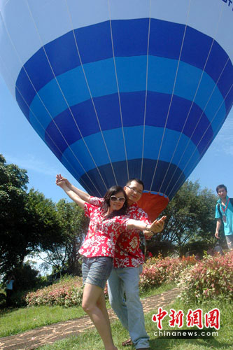 全國(guó)的30支熱氣球隊(duì)來(lái)助興。在?谌f(wàn)綠園上空漂游的熱氣球上,北京的劉先生突然“變出”一枚鉆戒向女友求婚。他笑著說(shuō),從網(wǎng)上看到海口旅游婚慶的消息就瞞著女友報(bào)了名,為的是上演在熱氣球上求婚一幕。