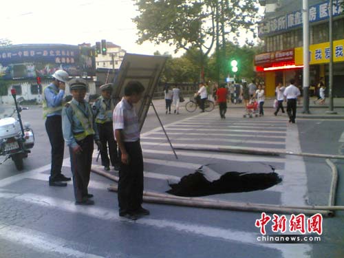 記者在現(xiàn)場(chǎng)看到,大坑出現(xiàn)在南京長(zhǎng)樂(lè)路與箍桶巷的交界處,是南京鬧市區(qū)主干道,每日人流、車流十分密集。據(jù)交警三大隊(duì)保安韓金林介紹,當(dāng)時(shí)他正在該路段執(zhí)勤,突然“轟隆”一聲,地面就塌陷了一個(gè)大坑,他趕緊找來(lái)幾根長(zhǎng)竹竿圍擋,防止人車陷坑。在場(chǎng)三大隊(duì)交警胡博告訴記者,他還是第一次在南京遇到“天坑”。