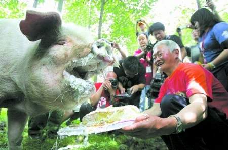 王福清、萬(wàn)興明和劉大會(huì)只好將蛋糕拿到樹(shù)林里去!柏i堅(jiān)強(qiáng)”嗅了嗅從來(lái)沒(méi)有吃過(guò)的蛋糕,張開(kāi)大嘴吃起來(lái)。人們爭(zhēng)相去看,為它拍照,“豬堅(jiān)強(qiáng)”被圍得嚴(yán)嚴(yán)實(shí)實(shí)。王福清還給它臉上抹上了奶油。