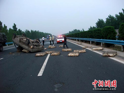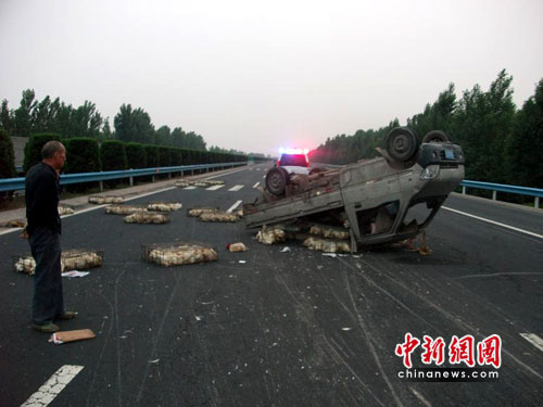 2010年6月22日中午13時許,炙熱的太陽照得大地只想冒煙,一輛白色小貨車滿載雞子疾馳在京港澳高速公路上。當行駛到京港澳高速632公里西半幅時,突然“咚”一聲響,坐在駕駛位上的李某突然感覺車輛傾倒,控制不住疾馳的貨車,車輛側(cè)翻在高速公路上,滿車的雞子撒在路上,到處都是雞毛。河南高速交警總隊黃河二橋大隊接到過路司機的報警后,迅速趕到事故現(xiàn)場,設(shè)置警戒帶,迅速搶救傷員,所幸駕駛員李某事先行車時扎緊了安全帶,只是受了皮外傷,在急救人員救出時依然茫然不知所措。在民警、路政工作人員的共同努力下,迅速清理現(xiàn)場,恢復路面正常通行。