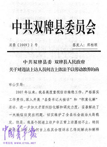 33歲的何守業(yè)至今不敢回家。其父何吉上因舉報(bào)村支書侵占退耕還林款未見“效果”,多次上告,被認(rèn)定“沖擊國(guó)家機(jī)關(guān)”。在檢察機(jī)關(guān)認(rèn)定其不構(gòu)成犯罪之后,湖南省永州市雙牌縣委書記鄭柏順簽發(fā)“勞教”文件。2009年8月,永州市“勞教委”決定對(duì)何吉上勞動(dòng)教養(yǎng)一年。