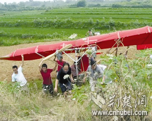 5月10日,武漢東湖開發(fā)區(qū)農(nóng)民舒滿勝,花費10萬元自造土飛機,試飛失敗并受皮外傷。昨日上午,舒滿勝的土飛機再次試飛,未像上次一樣通知媒體,當(dāng)?shù)夭糠执迕衲繐袅巳^程。據(jù)目擊者胡先生介紹,昨日上午9時許,舒滿勝的土飛機就被拉到江夏區(qū)五里界鎮(zhèn)醬栗廟路段,在經(jīng)過三四十分鐘的試驗性滑行后,于上午10時準時起飛。土飛機“助跑”約200米后,舒滿勝拉動起飛桿,飛機輪滑輪脫離地面,機身離地面只有兩三米,飛行不過10米,一頭栽進路邊稻田里(如圖),舒滿勝被甩出飛機左腿受傷。隨后,舒滿勝被送往流芳醫(yī)院。經(jīng)檢查,其左腿髕骨骨折,需手術(shù)治療。