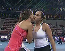在土耳其伊斯坦布爾舉行的2011年WTA年終總決賽開始了次日的爭奪。在一場白組的小組賽上,中國金花、法網(wǎng)冠軍李娜雖然一度浪費發(fā)球勝賽局,但仍然以7-6(4)/6-4擊敗了莎拉波娃,取得總決賽的首場勝利,同時是個人兩個月內的首場勝利。而兩連敗的莎拉波娃,小組出線僅剩理論上的可能。