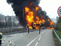 實(shí)拍:21噸油罐車起火 司機(jī)死里逃生