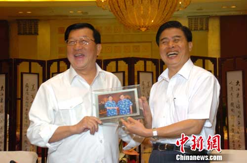 9月11日晚,廣東省省長(zhǎng)黃華華在廣州東方賓館會(huì)見了應(yīng)邀來(lái)訪的臺(tái)灣新竹縣縣長(zhǎng)、世界客屬總會(huì)會(huì)長(zhǎng)邱鏡淳等一行。圖為臺(tái)灣新竹縣長(zhǎng)、世界客屬總會(huì)會(huì)長(zhǎng)邱鏡淳向黃華華省長(zhǎng)贈(zèng)送于今年8月黃華華省長(zhǎng)訪臺(tái)時(shí)兩人的合照。