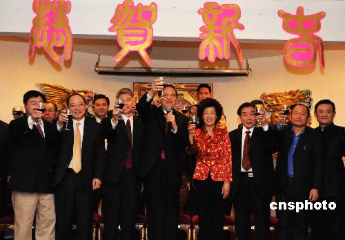 當(dāng)?shù)貢r(shí)間1月16日晚,中國(guó)駐美大使周文重(前排中)和夫人謝淑敏女士(前右四)在華盛頓中國(guó)城,向來(lái)自海峽兩岸的大華府十八個(gè)最大僑社領(lǐng)袖以及大華府地區(qū)及廣大旅美僑胞祝賀牛年新春。圖為周大使夫婦和僑社領(lǐng)袖們向廣大僑胞敬酒賀新春。中新社發(fā) 邱江波 攝