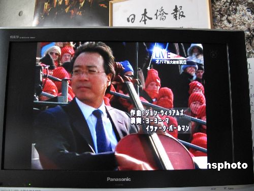 圖為日本電視臺實況轉(zhuǎn)播奧巴馬就職大典時馬友友演奏大提琴的鏡頭。美國華裔大提琴家馬友友,當(dāng)?shù)貢r間1月20日中午在奧巴馬的就職大典上,與其它三位音樂家合演了《空氣與簡樸禮物》(Air and Simple Gifts),獻(xiàn)給新總統(tǒng)。據(jù)報道,馬友友曾應(yīng)邀在五位美國總統(tǒng)面前獻(xiàn)藝,最早的一位是肯尼迪總統(tǒng),當(dāng)時的馬友友年僅七歲,與胞姐一起在白宮演出。馬友友16日接受哥倫比亞廣播公司訪問時興奮地說,“簡直不敢相信,這是四十五年前的事了”。但這可能比不上1月20日為奧巴馬在就職典禮上的表演,讓他感到更光榮與驕傲。中新社發(fā) 段躍中 攝