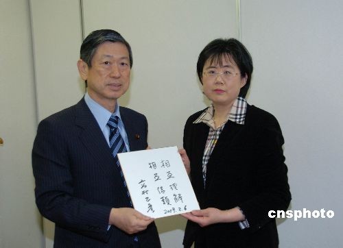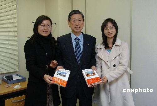 2月6日上午,日本前外相、日中友好議員聯(lián)盟會長、眾議院議員高村正彥,在東京接見了第四屆中國人日語征文大賽主辦單位日本僑報社代表和兩名最優(yōu)秀獎(日本大使獎)獲獎?wù)摺本┐髮W(xué)研究生徐蓓和湘潭大學(xué)青年教師張桐赫。高村正彥聽取了日本僑報社關(guān)于日中作文大賽的匯報,高度評價大賽為促進日中兩國人民的相互理解起了積極的作用。高村勉勵獲獎?wù)吆退袇①愓呃^續(xù)努力,為日中交流作出更大貢獻。高村正彥當場揮毫,題寫了“相互理解 相互信賴”,表達對日中兩國青少年的期待。中新社發(fā) 段躍中 攝