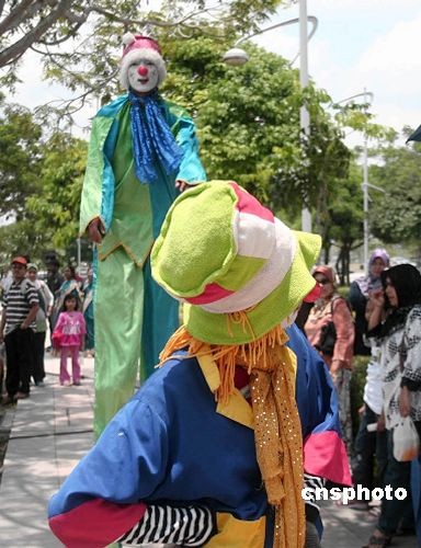 3月21日,馬來西亞首都吉隆坡新行政中心布城舉行熱氣球嘉年華活動,踩著高蹺的小丑進行表演吸引當(dāng)?shù)孛癖。中新社發(fā) 趙勝玉 攝