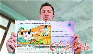據(jù)悉,英軍士兵在塔利班據(jù)點(diǎn)內(nèi)一面墻上發(fā)現(xiàn)這本月歷。與普通的美女、跑車或者風(fēng)景月歷不同,塔利班月歷一月份封面人物是基地組織頭目拉登和塔利班最高頭目奧馬爾,他們身邊放著錢和武器,手指著被塔利班炸毀的巴米揚(yáng)大佛。二月份月歷封面是一個(gè)塔利班墳場(chǎng)。這本月歷上不僅有普什圖語(yǔ),而且還有阿拉伯語(yǔ)、波斯語(yǔ)和英語(yǔ)。英軍上尉提姆-利云頓稱:“我先前從未看到過(guò)這樣的塔利班宣傳材料,尤其是使用非英語(yǔ)文字的。”