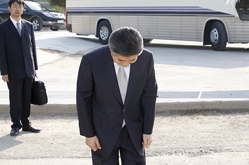 4月30日,韓國(guó)前總統(tǒng)盧武鉉從位于首都首爾東南約450公里的家中離開(kāi),準(zhǔn)備接受檢察機(jī)關(guān)的質(zhì)詢(xún)時(shí)向媒體記者鞠躬。