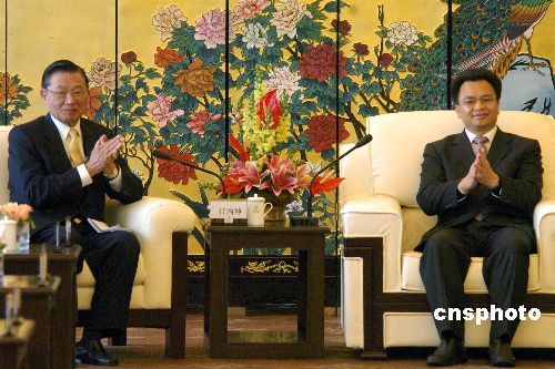 一月九日中午,廣州花園酒店,廣東省副省長萬慶良會見臺灣;鶗麻L江丙坤及海協會與海基會聯合參訪團一行。中新社發(fā) 柯小軍 攝
