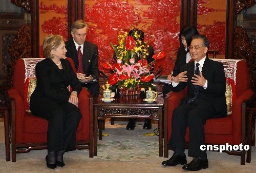 2月21日下午,中國國務(wù)院總理溫家寶在北京中南海紫光閣會見美國新任國務(wù)卿希拉里·克林頓。溫家寶在會見中引用《孫子兵法》中“同舟共濟(jì)”的成語,比喻中美兩國關(guān)系。中新社發(fā) 任晨鳴 攝