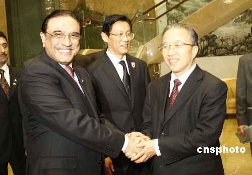 2月21日晚,中國國務委員戴秉國代表中國政府在武漢會見了到訪的巴基斯坦總統(tǒng)扎爾達里。應中國政府邀請,20日至23日,扎爾達里總統(tǒng)將先后訪問湖北和上海,考察中國水利、農業(yè)、金融等領域發(fā)展情況。中新社發(fā) 艾啟平 攝