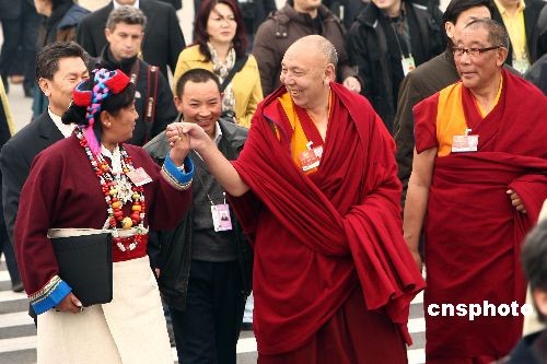 3月3日,全國政協(xié)十一屆二次會議在北京人民大會堂開幕。來自西藏的委員攜手出席會議。中新社發(fā) 杜洋 攝