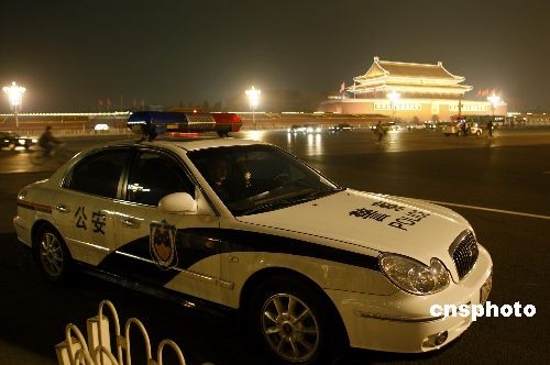 3月3日晚,北京警方在天安門廣場周邊加強(qiáng)夜間巡邏,確!皟蓵卑踩。中新社發(fā) 鄭雄增 攝
