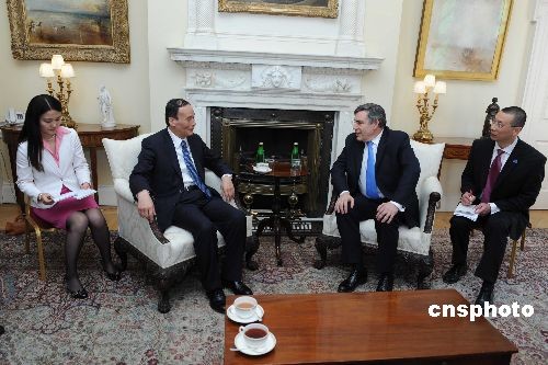 當(dāng)?shù)貢r(shí)間5月11日,英國(guó)首相布朗在倫敦唐寧街10號(hào)首相府會(huì)見中國(guó)國(guó)務(wù)院副總理王岐山。王岐山于5月8日至12日期間對(duì)英國(guó)進(jìn)行訪問,并與英國(guó)財(cái)政大臣達(dá)林共同主持了第二次中英經(jīng)濟(jì)財(cái)金對(duì)話。中新社發(fā) 魏群 攝