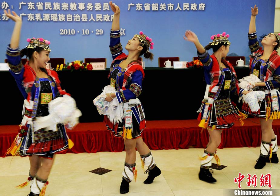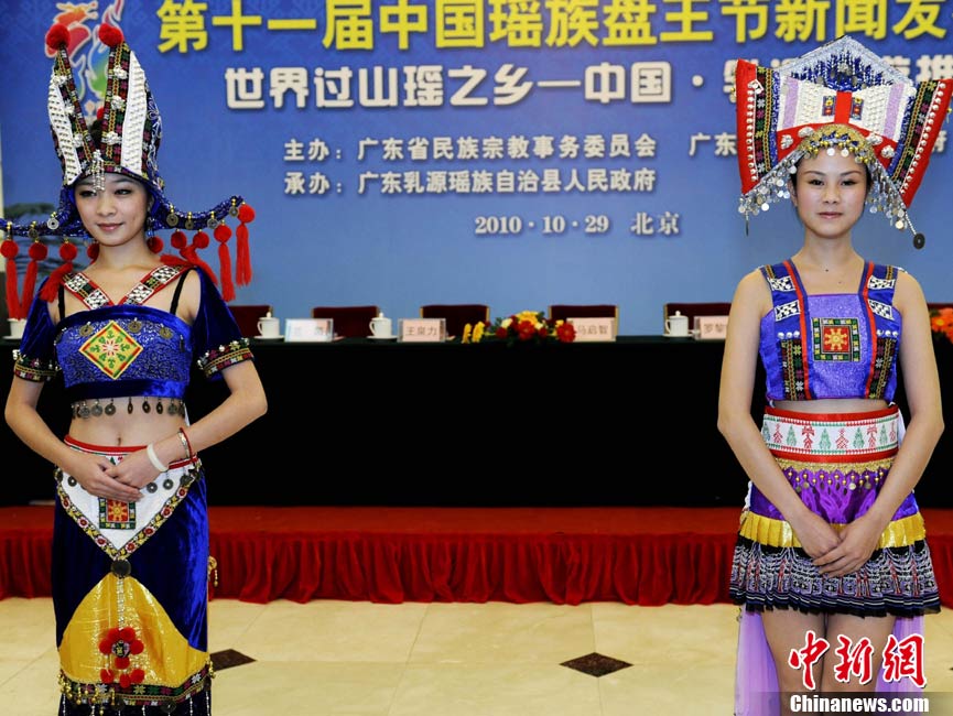 10月29日,第十一屆中國瑤族盤王節(jié)新聞發(fā)布會(huì)暨世界過山瑤之鄉(xiāng)——中國乳源旅游推介會(huì)在人民大會(huì)堂召開。本次會(huì)議發(fā)布,世界瑤族人民的盛會(huì)——第十一屆中國瑤族盤王節(jié)將于2010年11月20日至22日在廣東乳源瑤族自治縣隆重舉行,幾灞P王節(jié)是瑤族人民紀(jì)念其始祖盤王(盤瓠)的盛大節(jié)日。圖為“瑤族公主”形象代表身著湘粵桂南嶺地區(qū)的瑤族盛裝亮相新聞發(fā)布會(huì)。中新社記者 劉震 攝