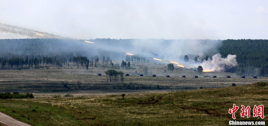 8月12日,“和平使命-2013”聯(lián)合反恐軍演中俄兩軍參演部隊(duì)在切巴爾庫爾合同訓(xùn)練場舉行全員全要素實(shí)兵協(xié)同訓(xùn)練。雙方共出動(dòng)官兵近900人,坦克、步戰(zhàn)車、直升機(jī)等武器裝備約130臺(tái),雙方導(dǎo)演部總導(dǎo)演——俄中部軍區(qū)司令員波格諾夫斯基和沈陽軍區(qū)副司令員石香元,共同到演習(xí)地觀摩并指導(dǎo)兩軍訓(xùn)練。中新社發(fā) 李祥輝 攝