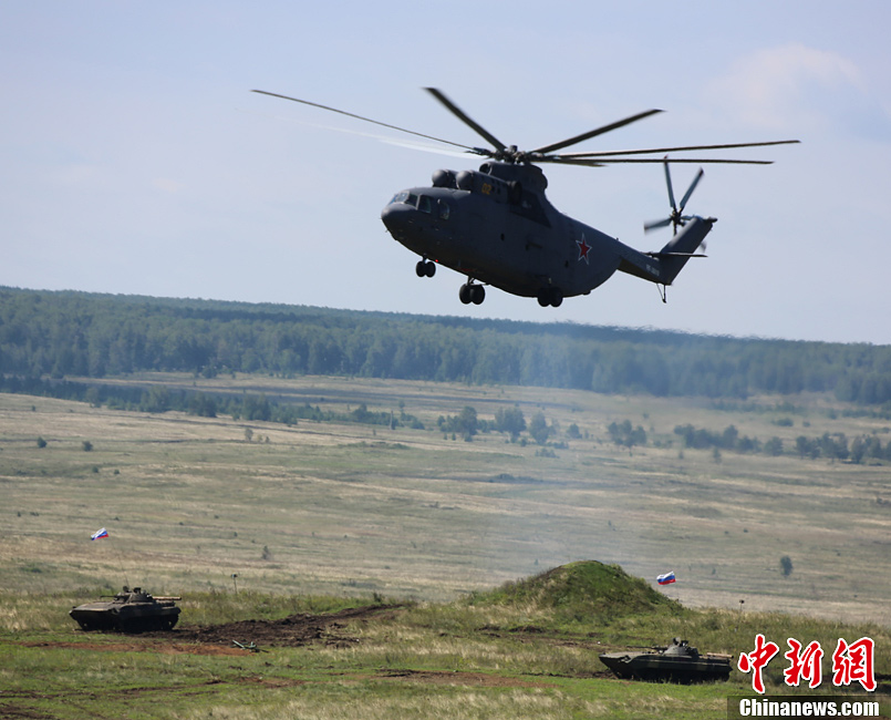 8月12日,“和平使命-2013”聯(lián)合反恐軍演中俄兩軍參演部隊在切巴爾庫爾合同訓(xùn)練場舉行全員全要素實(shí)兵協(xié)同訓(xùn)練。雙方共出動官兵近900人,坦克、步戰(zhàn)車、直升機(jī)等武器裝備約130臺,雙方導(dǎo)演部總導(dǎo)演——俄中部軍區(qū)司令員波格諾夫斯基和沈陽軍區(qū)副司令員石香元,共同到演習(xí)地觀摩并指導(dǎo)兩軍訓(xùn)練。中新社發(fā) 李祥輝 攝