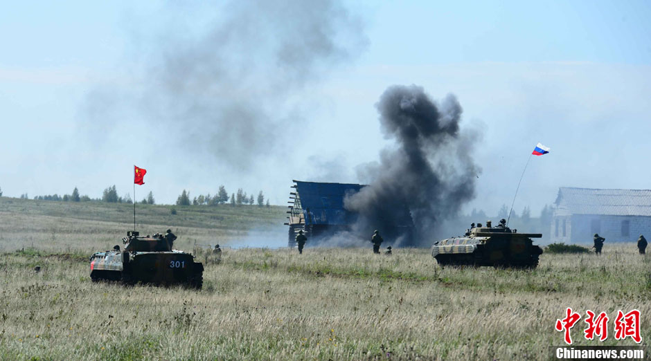 8月12日12時(北京時間下午2時),“和平使命-2013”中俄聯(lián)合反恐軍事演習(xí),在俄羅斯切巴爾庫爾合同訓(xùn)練場進(jìn)行了實兵實彈協(xié)同訓(xùn)練。圖為中俄雙方參演官兵共同向前推進(jìn)清剿殘敵。中新社發(fā) 譚長俊 攝