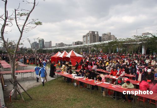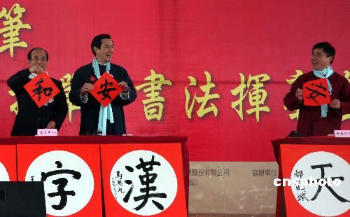 臺北市政府主辦的第五屆“漢字文化節(jié)”于二〇〇九年的第一天在臺北中央藝文公園舉行,吸引了一萬二千多民眾共揮毫迎新年。圖為臺灣地區(qū)領(lǐng)導(dǎo)人馬英九,臺灣立法機(jī)構(gòu)負(fù)責(zé)人王金平和臺北市長郝龍斌等各界人士共同揮毫為新年祈福。中新社發(fā) 路梅 攝