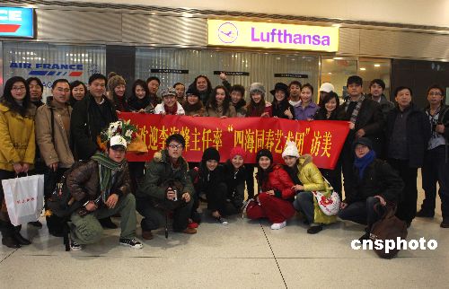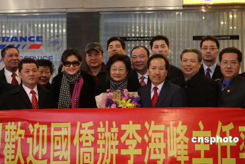1月28日,中國國務(wù)院僑辦主任李海峰率領(lǐng)“文化中國·四海同春”藝術(shù)團(tuán)一行40人抵達(dá)紐約,開始在美國為期19天的藝術(shù)之旅,與美國華人華僑同慶新春。著名歌唱家宋祖英、閻維文等隨團(tuán)抵達(dá)。中國駐紐約總領(lǐng)事彭克玉、美東華人社團(tuán)聯(lián)合總會共同主席梁冠軍和陳清泉、秘書長林學(xué)文,美國福建同鄉(xiāng)會代主席鄭棋,美國福建公所代主席鄭時甘,美國上海聯(lián)誼會會長承立平,崇正會主席朱天長等紐約當(dāng)?shù)貎S領(lǐng)及各客屬僑團(tuán)負(fù)責(zé)人等,均到機(jī)場迎接李海峰一行。中新社發(fā) 魏晞 攝