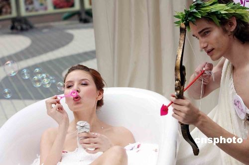 二月五日,為迎接情人節(jié),香港一家商場在銅鑼灣鬧市街頭上演美人出浴,推介情人節(jié)沐浴套裝,化身“愛神”丘比特的模特也來湊熱鬧,一起預(yù)祝情人節(jié)甜甜蜜蜜沐浴愛河。中新社發(fā) 洪少葵 攝