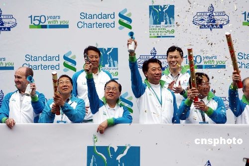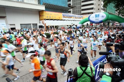 二月八日清晨,香港一年一度的馬拉松賽在尖沙咀彌敦道舉行,特區(qū)行政長官曾蔭權及眾多嘉賓主持全程馬拉松賽起步儀式。本屆馬拉松賽三項賽事共吸引中外選手五萬五千人參加,打破歷屆紀錄。中新社發(fā) 洪少葵 攝