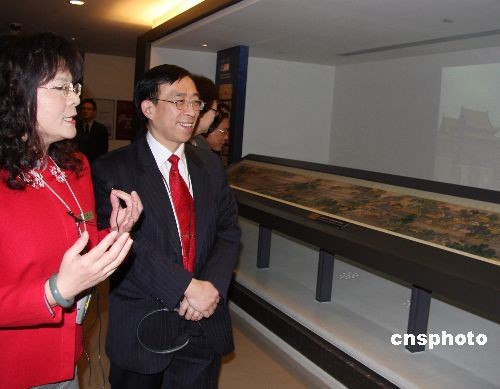 2月26日,上海博物館館長(zhǎng)陳?ài)凭?中)一行應(yīng)邀抵達(dá)臺(tái)北參訪。圖為陳?ài)凭恍性谂_(tái)北故宮參觀,聽(tīng)工作人員介紹結(jié)合了聲光效果的《清明上河圖》復(fù)制品。中新社發(fā) 路梅 攝