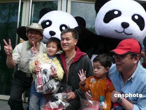 從1月26日農(nóng)歷春節(jié)大年初一正式與臺灣民眾見面到二月二十八日,大陸贈臺大熊貓“團團”和“圓圓”吸引臺灣民眾參觀人數(shù)已突破五十萬人。二十八日,第五十萬名幸運觀眾是來自臺灣彰化縣的八歲男童魏奕凱(左二),他的父親魏豐評(左三)以及另一名來自苗栗縣的五歲男童邱冠綸(右二),分別為第五十萬零一和第四十九萬九千九百九十九名觀眾。臺北市立動物園園長葉杰生(左一)向這三名幸運觀眾贈送裝滿大熊貓禮品的福袋和大熊貓玩偶作為紀(jì)念。中新社發(fā) 路梅 攝