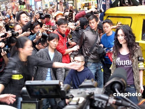 三月十一日,藝人不雅照女主角之一的鐘欣桐(阿嬌)復(fù)出后首次現(xiàn)身香港鬧市街頭,引來數(shù)百人圍觀,爭(zhēng)相拍攝。阿嬌復(fù)出后首份工作是擔(dān)任一個(gè)牛仔褲品牌的代言人,當(dāng)日出席該品牌一分店的宣傳活動(dòng)。中新社發(fā) 黎金良 攝