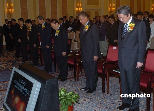 “推進(jìn)粵港澳更緊密合作大型研討會(huì)”五月十二日在澳門(mén)舉行。開(kāi)幕前,澳門(mén)特區(qū)行政長(zhǎng)官何厚鏵、中央駐澳聯(lián)絡(luò)辦主任白志健、外交部駐澳特派員公署特派員盧樹(shù)民、香港特區(qū)政府財(cái)政司司長(zhǎng)曾俊華等與會(huì)的兩岸四地人士為汶川地震遇難者默哀一分鐘。中新社發(fā) 畢永光 攝