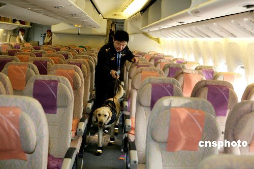 春節(jié)前夕,兩條名叫“維特”和“泰格”的拉布拉多緝毒犬出現在T3航站樓一架來自阿聯(lián)酋的飛機機艙內。這是中國緝毒犬在歷史上首次登機檢查。近年來北京空港口岸人體藏毒和行李夾層藏毒案件明顯增多。為了進一步增加緝毒手段的主動性,提高口岸查毒的準確率,北京海關緝私局決定訓練緝毒犬進行登機檢查。海關緝毒人員對付跨國販毒分子又多了一個殺手锏。中新社發(fā) 雷虹 攝