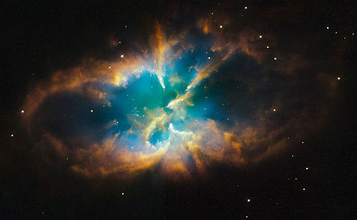據(jù)美國每日太空網(wǎng)報(bào)道,哈勃太空望遠(yuǎn)鏡日前拍攝到銀河系內(nèi)一個(gè)罕見的美麗行星狀星云NGC2818,它隱藏在一個(gè)距離地球1萬光年羅盤星座的恒星團(tuán)內(nèi)部。這張精美的圖片是由哈勃太空望遠(yuǎn)鏡廣角行星2號相機(jī)于2008年11月份拍攝的,其彩色部分分別代表著該星云的噴射釋放物質(zhì),它們共同組成細(xì)絲狀漩渦結(jié)構(gòu),其中紅色部分代表氮?dú)、綠色部分代表氫氣、藍(lán)色部分代表氧氣。