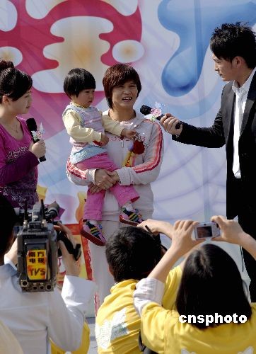 三月十五日,由南方電視臺(tái)少兒頻道主辦的“第三屆長(zhǎng)安寶寶大賽”啟動(dòng)儀式在廣東東莞東城文化中心舉行。奧運(yùn)冠軍冼東妹與她的女兒參加比賽后接受媒體采訪。中新社發(fā) 劉衛(wèi)勇 攝