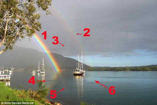 人們幾乎看不清楚第六道彩虹,但是考利博士堅持稱,如果你認真看,你就能看到第六道彩虹。他說:“諾拉的照相機只拍到了第六道彩虹(圖示6)的部分,它是河面的一次反射,雨滴內(nèi)的兩次反射形成的。由于進行了多次反射,其顏色被擴散出去,它的外貌僅依稀可見!