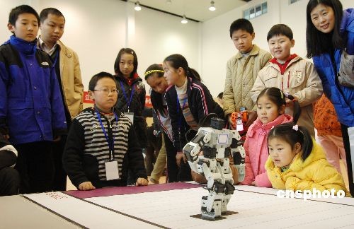 2009年3月29日,2009年“VEX”杯蘇州市青少年機(jī)器人比賽在蘇州善耕實(shí)驗(yàn)小學(xué)開幕,來(lái)自蘇州敬文實(shí)驗(yàn)小學(xué)及其周邊縣市的77所中小學(xué)校的467位選手參賽,參賽者分別進(jìn)行了機(jī)器人“踢足球”、“滅火”和“基本技能”等八個(gè)項(xiàng)目的角逐,場(chǎng)面十分熱鬧。中新社發(fā) 蘇民 攝