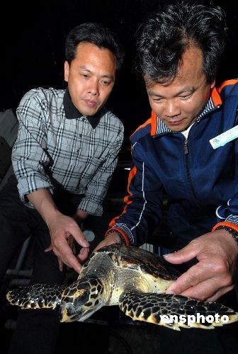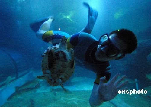4月13日,福州一漁民將其幾天前在海邊偶然發(fā)現(xiàn)的“玳!焙}斔瓦M(jìn)福州左海海底世界。這只“玳!遍L約12厘米,重約1750克,嘴如鷹嘴,甲殼為褐色,頜緣鋸齒狀。據(jù)飼養(yǎng)員介紹,這只小海龜大約才2歲,還屬于“嬰兒”狀態(tài)!扮殍!庇址Q十三鱗,屬于國家二級保護(hù)動物,一般壽命可達(dá)1500歲,成年的玳瑁(約20多歲)身長1米,體重40~60公斤,主要生長于熱帶及亞熱帶地區(qū)的暖水性海洋。該類海龜在中國主要分布于臺灣、福建和海南等沿海一帶海域。 中新社發(fā) 穆長梓 攝