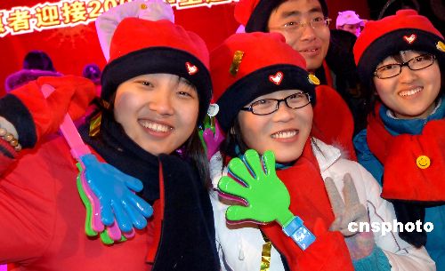 北京:2009年元旦零時(shí)到來時(shí)刻,北京600多名志愿者及社會(huì)名流在鐘鼓樓廣場(chǎng)聚會(huì),參加北京志愿者協(xié)會(huì)等部門共同舉辦的“微笑北京,和諧先鋒”主題活動(dòng),并狂歡慶新年到來。此活動(dòng)是600名志愿者和社會(huì)名流參會(huì)。北京奧運(yùn)會(huì)期間,10萬賽會(huì)志愿者、100萬社會(huì)志愿者、40萬城市志愿者和20萬拉拉隊(duì)志愿者在各類服務(wù)領(lǐng)域累計(jì)服務(wù)超過2億小時(shí)!≈行律绨l(fā) 鄒憲 攝