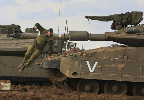 12月31日,在加沙邊境地區(qū),以軍集結(jié)大量坦克和士兵。圖為一名以軍士兵正從一輛坦克上跳下。目前,面對國際社會巨大壓力,以色列仍然拒絕停止對加沙地帶的大規(guī)?找u。