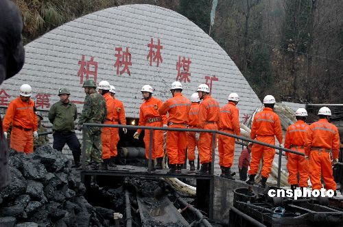 截至1月1日下午,安順透水事故搶險(xiǎn)救援工作仍在緊張有序進(jìn)行。貴州安順市消防支隊(duì)、安順軍分區(qū)等各級(jí)救援部門的救援人員已增加到500多人,正按照救援專家的預(yù)案,在全力采取抽水等措施緊急救援。目前,抽水設(shè)備已增加到兩臺(tái),礦井內(nèi)的積水正不斷下降。 2008年12月31日凌晨,貴州安順市西秀區(qū)蔡官鎮(zhèn)柏秧林煤礦發(fā)生一起透水事故,13名礦工被困井下。中新社發(fā) 郭勇 攝