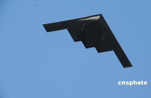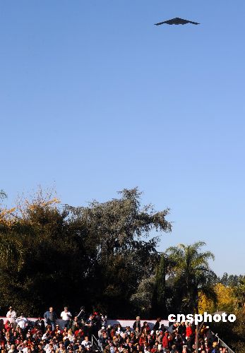 圖為一架美國(guó)空軍B-2隱形轟炸機(jī)掠過(guò)游行隊(duì)伍上空,為本屆花車游行助興。中新社發(fā) 張煒 攝
