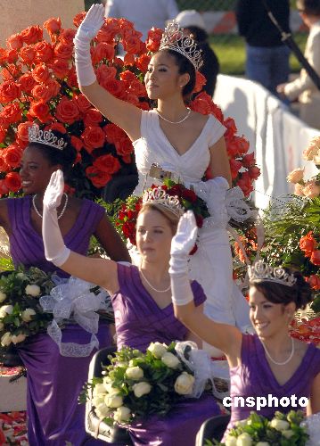 第120屆美國玫瑰花車大游行在美國加州帕薩迪納市正式舉行。新晉美國“玫瑰皇后”、華裔學(xué)生李君慧(上)與6名“玫瑰公主”一起乘坐玫瑰皇家花車引領(lǐng)大游行。