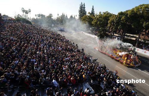 大游行吸引了來自全世界共46輛豪華花車、22個(gè)樂隊(duì)方陣和18個(gè)騎士方陣參加。帕薩迪納玫瑰花車大游行自1890年元旦舉辦以來已歷120屆,現(xiàn)已成為全美最主要的新年慶典活動(dòng)之一,與紐約時(shí)代廣場的跨年慶;顒(dòng)齊名。中新社發(fā) 張煒 攝
