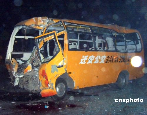 1月6日14時(shí)25分許,河北省遷安市發(fā)生一起重大交通事故。在遷安市祺光路與彭李路交叉口處,一名個體司機(jī)駕駛大貨車與遷安市公交公司13路公交車相撞,造成公交車兩名司乘人員當(dāng)場死亡,在送往醫(yī)院途中死亡一人,經(jīng)搶救無效死亡三人,另四名傷者正在醫(yī)院救治。 中新社發(fā) 翟羽佳 攝