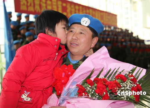 陳長青副大隊長和戰(zhàn)友們將在艱苦的環(huán)境中執(zhí)行任務8個月,他9歲的女兒陳宇在濟南機場和爸爸深情吻別。中新社發(fā) 畢華明 攝