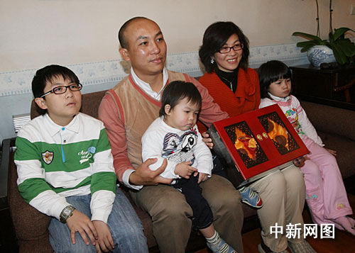 圖為胡祖杰一家五口向記者講述當(dāng)時情形,并展示習(xí)近平副主席贈送的茶具。